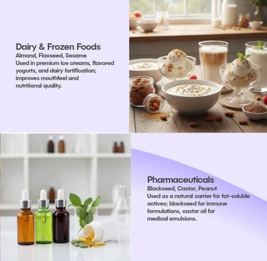 Castor Oil is a functional base oil with high viscosity and unique hydroxyl fatty acid composition. It is used in both pharma formulations and food processing where controlled release or emulsification is required.